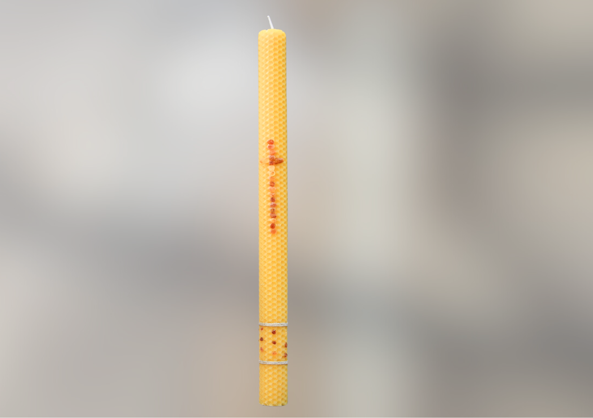 Krikšto ir Komunijos žvakė, pagaminta iš natūralaus bičių vaško, dekoruota tikru gintaru bei linu. Su dėžute.